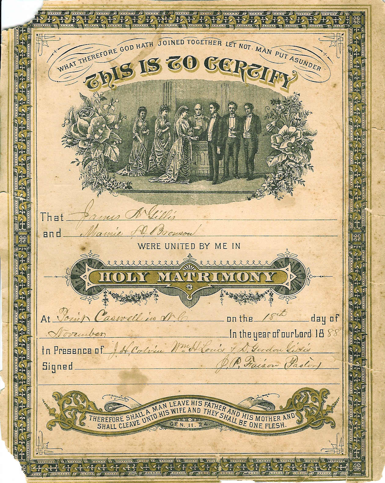 v. DAVID GORDON GILLIS, b. May 14, 1866, Fayetteville, N.C., Cumberland County; d. November 11, 1902, Fayetteville, N.C., Cumberland County; m. HATTIE A. GILLIS (?), July 28, 1895.